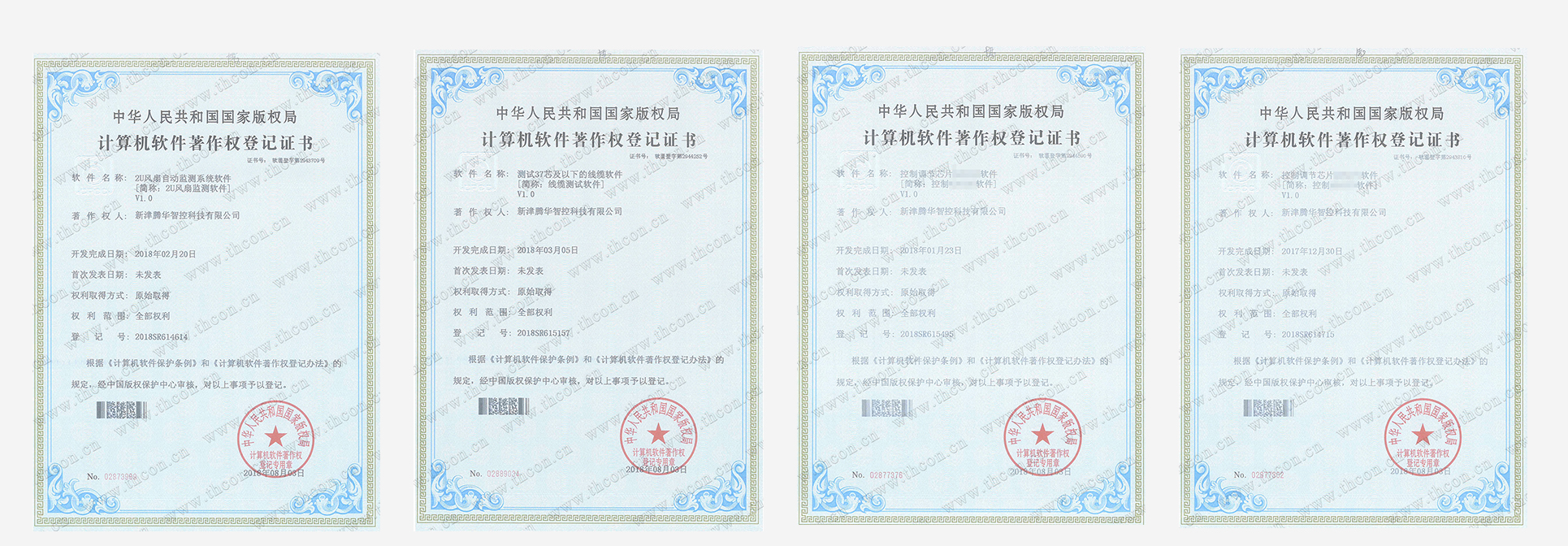 近日,由睿信科技(以下简称睿信科技)自主开发的“2U风扇自动监测系统软件”“测试37芯以下线缆软件”“控制调节芯片软件1”“控制调节芯片软件2”四项软件,顺利通过国家版权局的审查,获得由国家版权局颁发的计算机软件著作权登记证书;证书号分别为:软著登字第2943709号、第2944252号、第2943810号、第2944590号。这是睿信科技在软件著作权领域取得的又一新成绩。